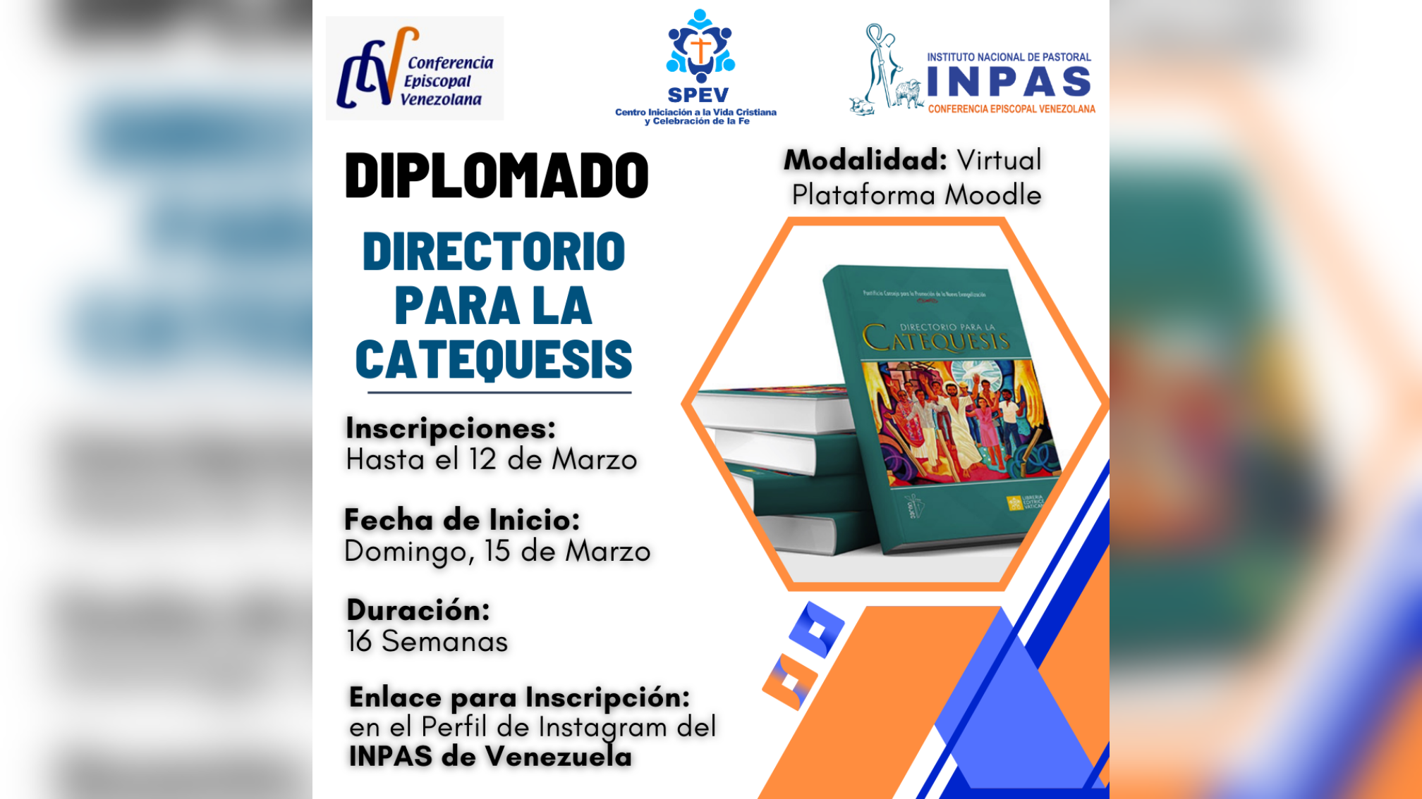 El Instituto Nacional de Pastoral (INPAS) de Venezuela, en alianza con la Coordinación de la Transmisión de la Fe del Centro para la Iniciación a la Vida Cristiana y Celebración de la Fe del Secretariado Permanente del Episcopado Venezolano, anuncia el inicio de las inscripciones para el diplomado “Profundización en el Directorio para la Catequesis”, destinado a fortalecer la formación catequética de agentes pastorales en el país.