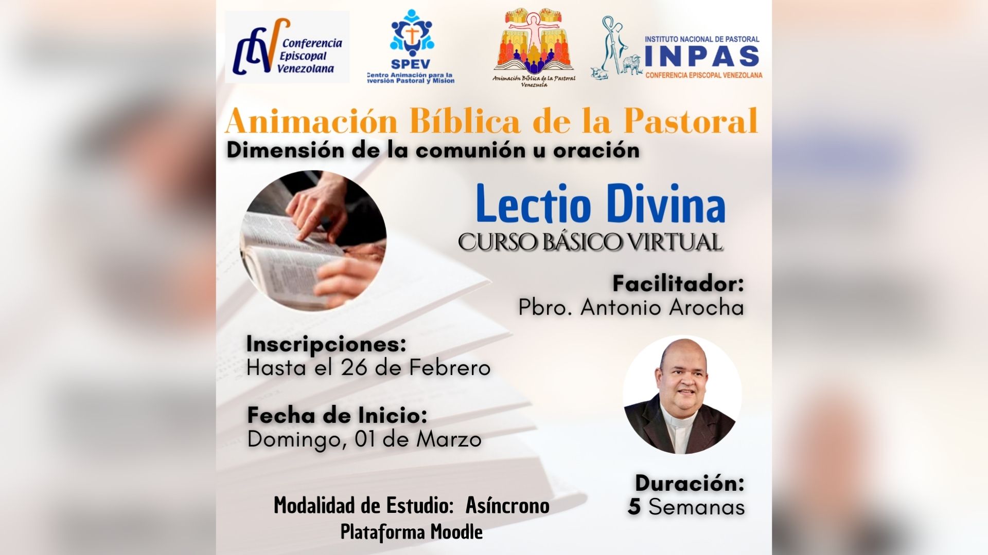 El Instituto Nacional de Pastoral (INPAS) de Venezuela, en alianza con la Coordinación de la Animación Bíblica de la Pastoral pertenenciente al Centro para la Animación para la Conversión Pastoral y Misionera del Secretariado Permanente del Episcopado Venezolano, ofrece el curso básico «Lectio Divina» en modalidad virtual.