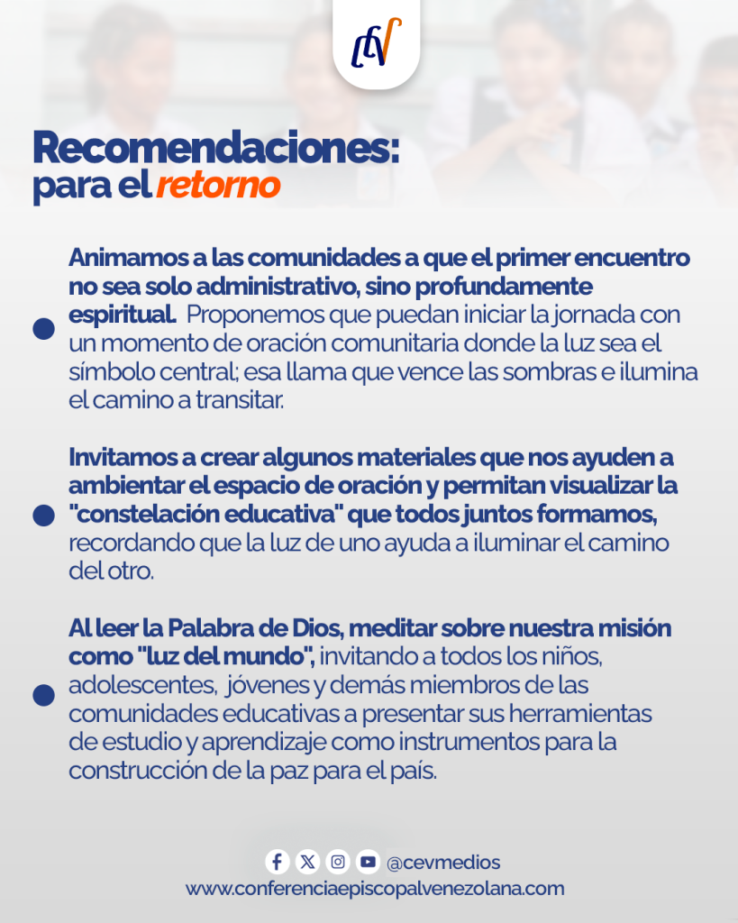 Caracas. En un mensaje con fecha del 09 de enero de 2026, la Comisión Episcopal de Educación de la CEV comparte palabras de cercanía con motivo del reinicio de actividades escolares el nuevo año civil.