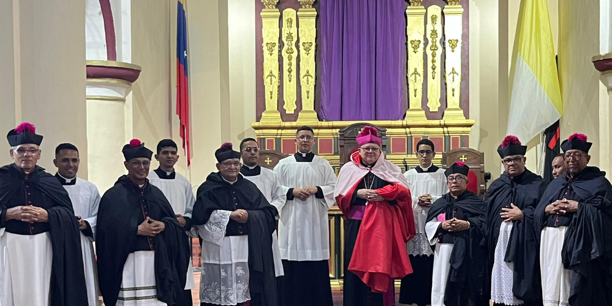 En un ambiente de profundo recogimiento y fe, la S.I. Catedral de Todos los Santos de la Arquidiócesis de Calabozo celebró la tradicional Ceremonia de las Señas. Este rito, recuperado como un tesoro de la liturgia local, invita a la feligresía a contemplar el sacrificio redentor de Jesucristo y su triunfo definitivo sobre las tinieblas. Un rito de tradición y fe Por tercer año consecutivo, la sede episcopal calaboceña se vistió de solemnidad para esta tradición ancestral. El rito fue presidido por Mons. Manuel Felipe Díaz Sánchez, Arzobispo Metropolitano de Calabozo, quien estuvo acompañado por el Ilustre Cabildo Catedralicio. El cuerpo de canónigos estuvo conformado por seis sacerdotes del clero arquidiocesano: -Pbro. Frank Gómez (Deán) -Pbro. Octavio Rodríguez Palma -Pbro. José María Pérez -Pbro. Ricardo Villa -Pbro. Luis Rey -Pbro. Carlos Macías La esperanza por encima de la adversidad Durante la homilía, Monseñor Manuel Felipe Díaz destacó que este encuentro espiritual es un anuncio de los Misterios Pascuasles que la Iglesia se dispone a conmemorar. »Esta ceremonia simboliza la esperanza cristiana por encima del desánimo y el pesimismo ante las adversidades», expresó el Prelado, exhortando a los fieles a mantener la mirada fija en la Resurrección. Simbolismo de las Señas Uno de los momentos más impactantes de la liturgia fue el despliegue de las «caudas»: largas capas negras vestidas por los canónigos que, al ser arrastradas, simbolizan el peso de los pecados de la humanidad y el luto por la Pasión del Señor. El rito alcanzó su clímax cuando el Arzobispo ondeó una bandera negra sobre el altar y los fieles presentes. Este gesto litúrgico representa la victoria de la fe sobre la muerte y el dominio de la Gracia sobre el pecado, preparando el corazón de la comunidad para la Semana Santa. 27 de marzo de 2026Fuente: Arquidiócesis de CalabozoCEV Medios