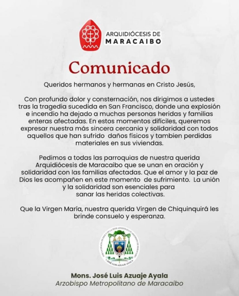 La Arquidiócesis de Maracaibo también se pronunció, emitiendo un comunicado en el que insta a todas las parroquias y a los fieles a unirse en oración y ofrecer su solidaridad a quienes han perdido sus hogares y bienes materiales.