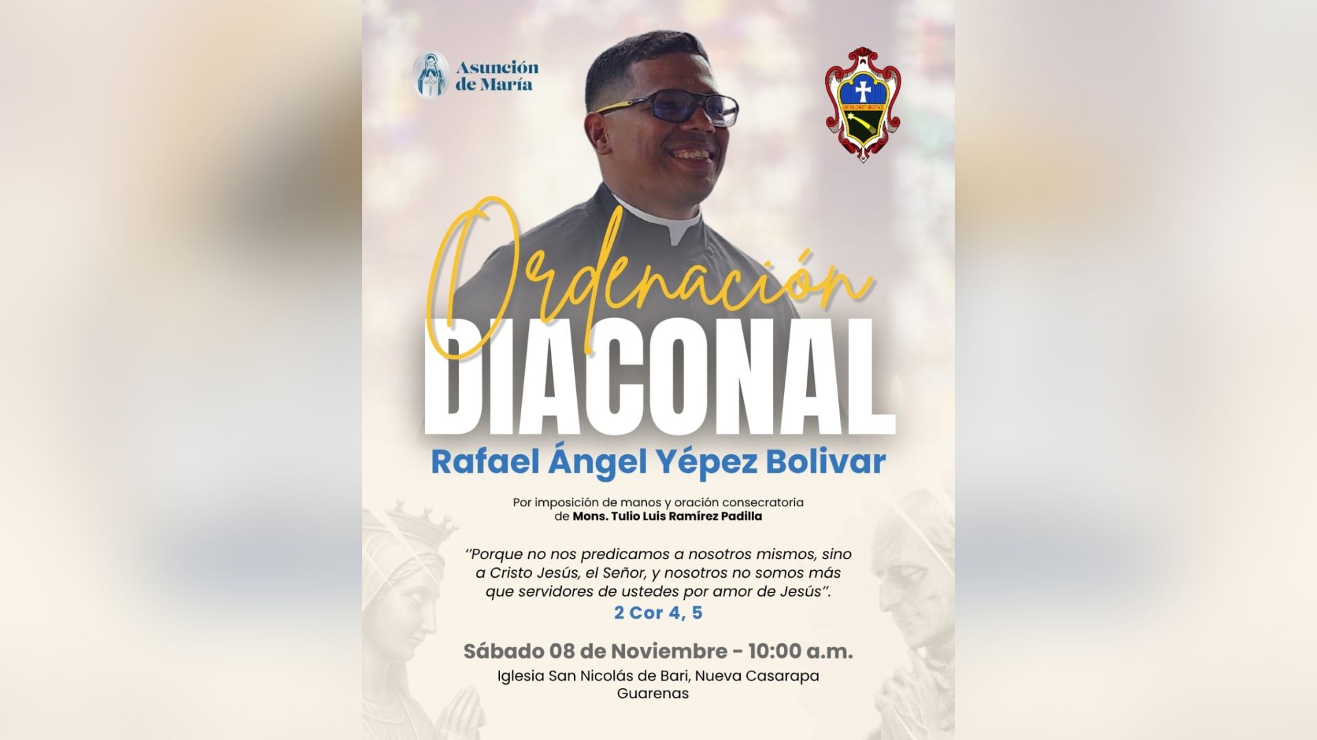 La ordenación diaconal de Rafael Yépez será por imposición de manos y oración consecratoria de Mons. Tulio Luis Ramírez Padilla, Obispo de Guarenas, durante la celebración litúrgica que tendrá lugar en la Iglesia San Nicolás de Bari, Nueva Casarapa – Guarenas, a las 10:00 a.m.